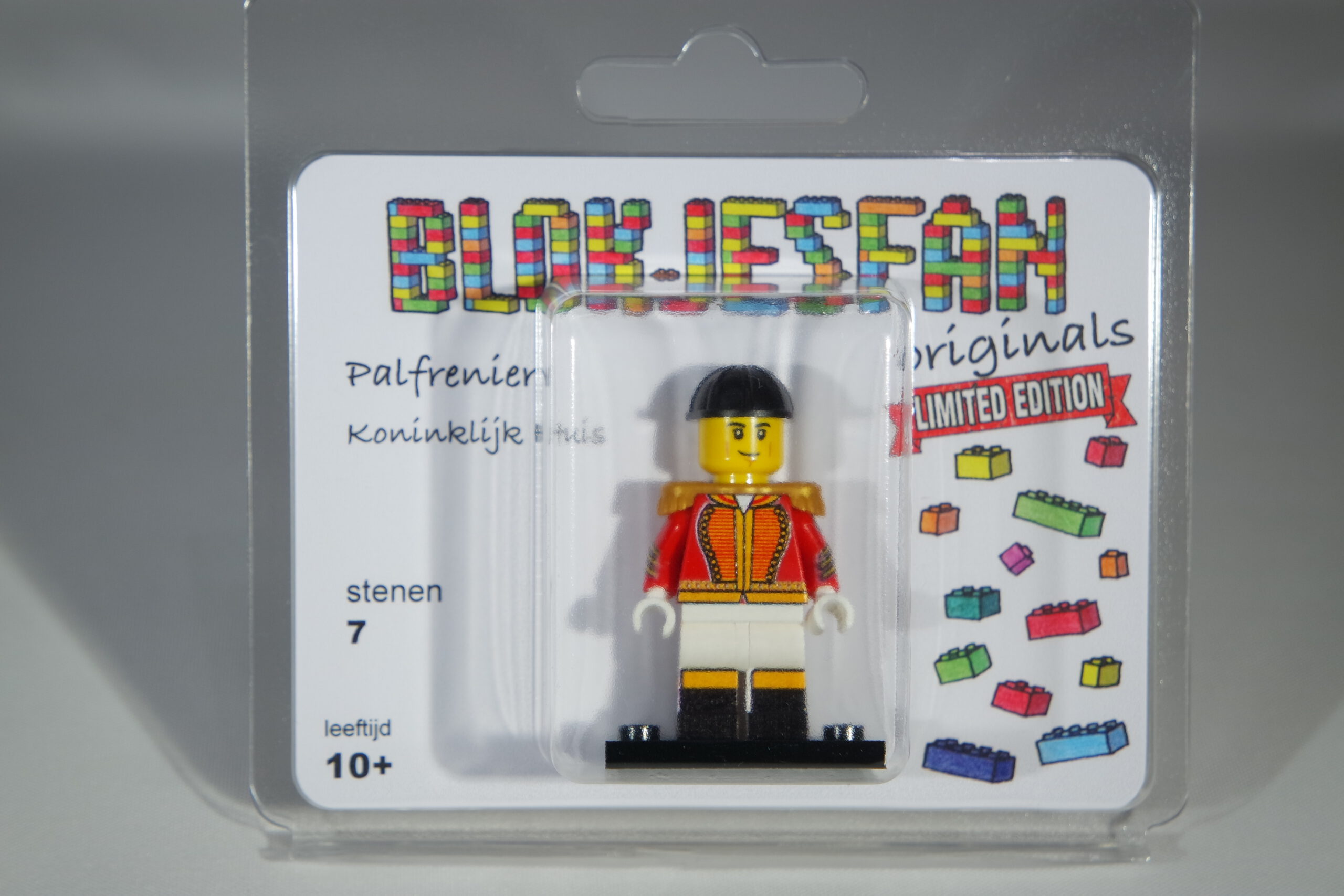 Dit poppetjes is samengesteld uit authentieke LEGO-onderdelen en heeft originele aangepaste prints op de beentjes, het lijfje en de armpjes. Het poppetje komt verpakt in zijn eigen blisterverpakking. In samenwerking met Brick-Print.nl maakt BLOKJESFAN een hele serie minifiguren in beperkte oplage. Wees er snel bij, want op=op!