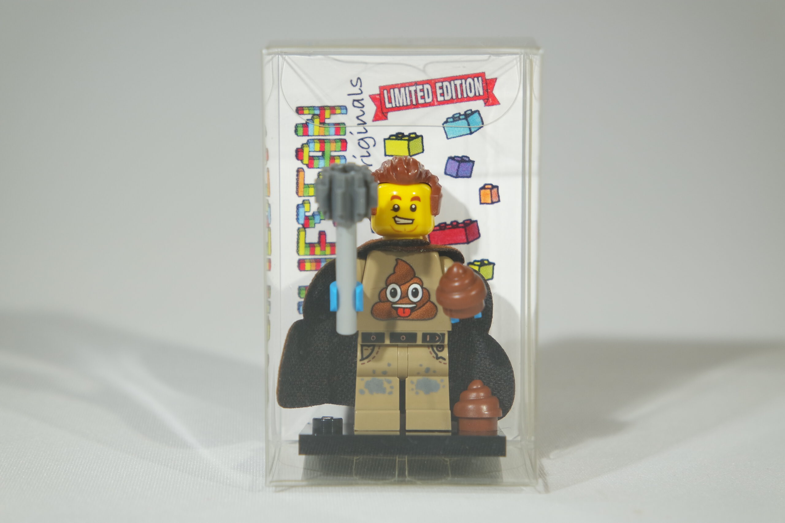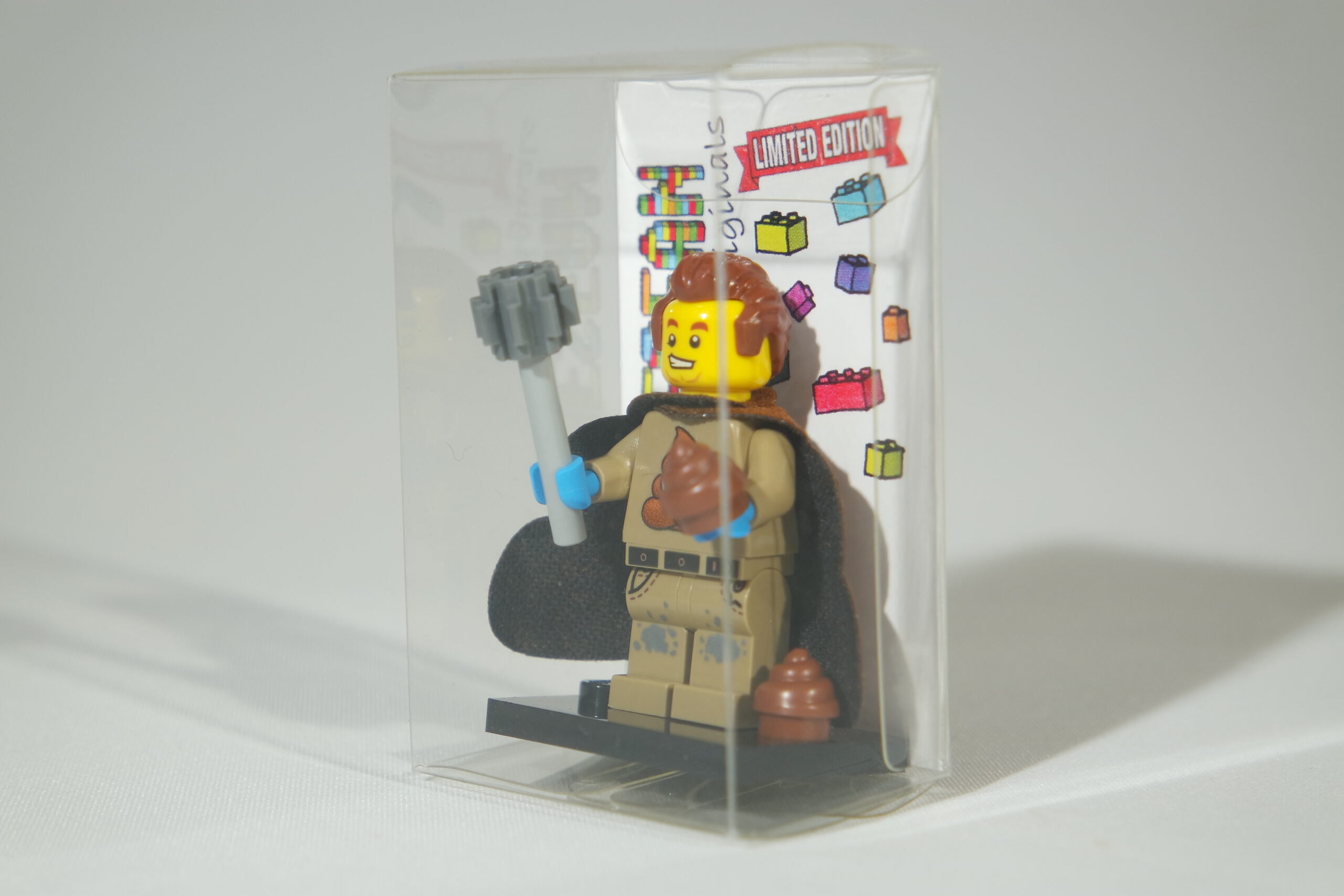 Dit poppetjes is samengesteld uit authentieke LEGO-onderdelen en heeft een originele aangepaste print op de borst. Uniek is het speciaal voor dit poppetje ontworpen capeje in de vorm van een drol. Het poppetje komt verpakt in zijn eigen blisterverpakking. In samenwerking met Brick-Print.nl maakt BLOKJESFAN de komende tijd een hele serie minifiguren in beperkte oplage. Wees er snel bij, want op=op!