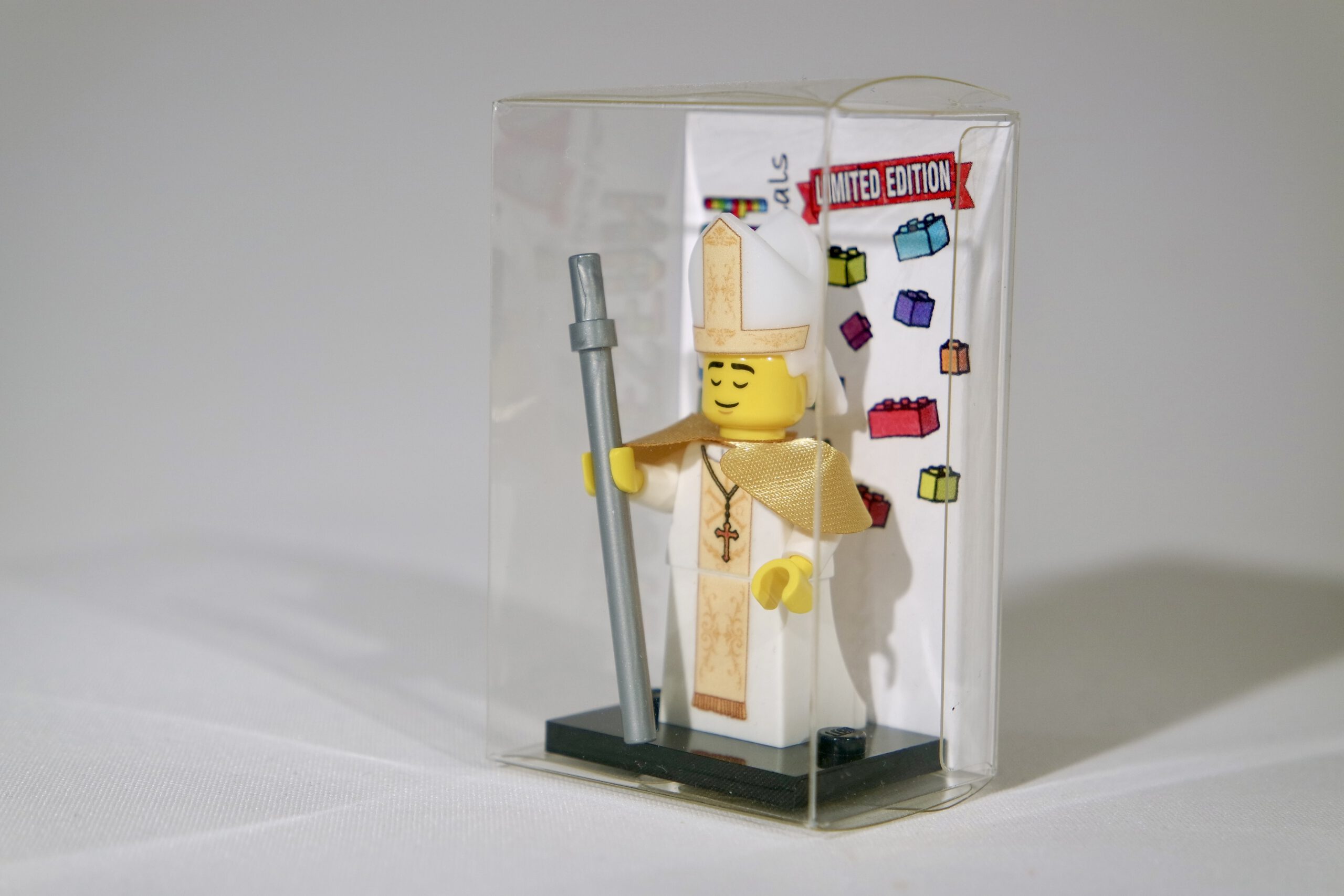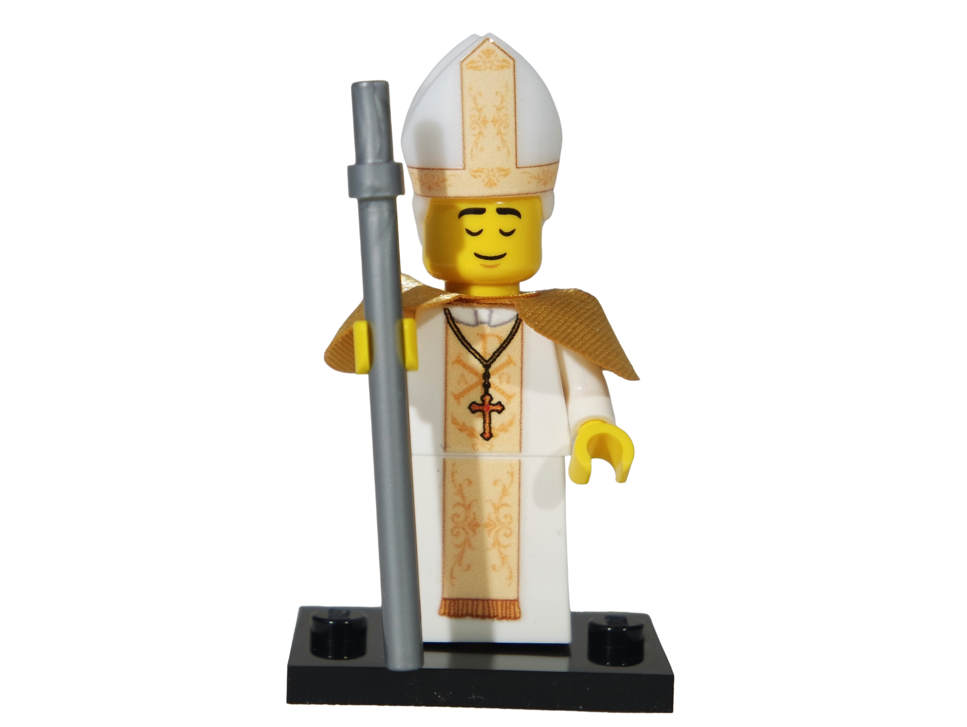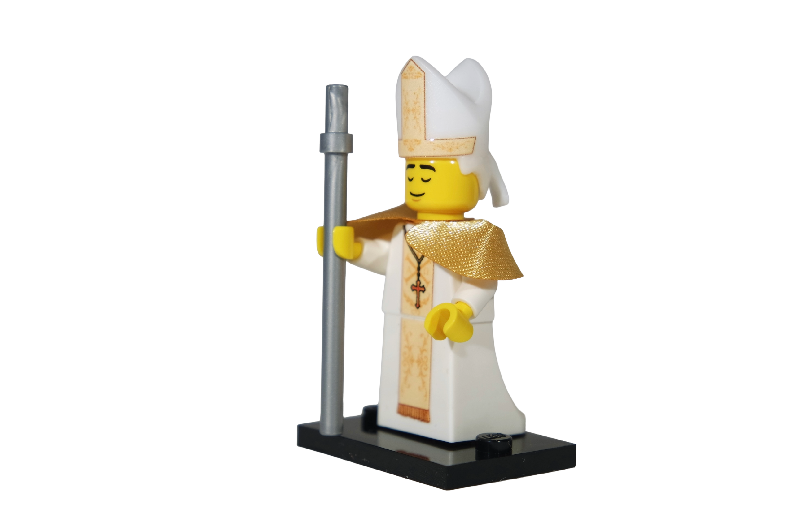 Deze minifiguur is samengesteld uit authentieke LEGO-onderdelen en heeft een unieke 3D-geprinte mijter en aangepaste prints op het lijfje en de mijter.