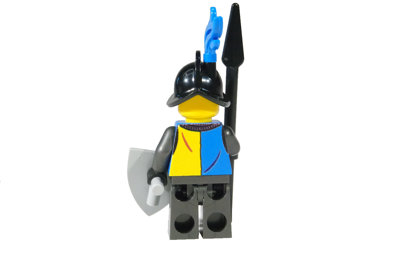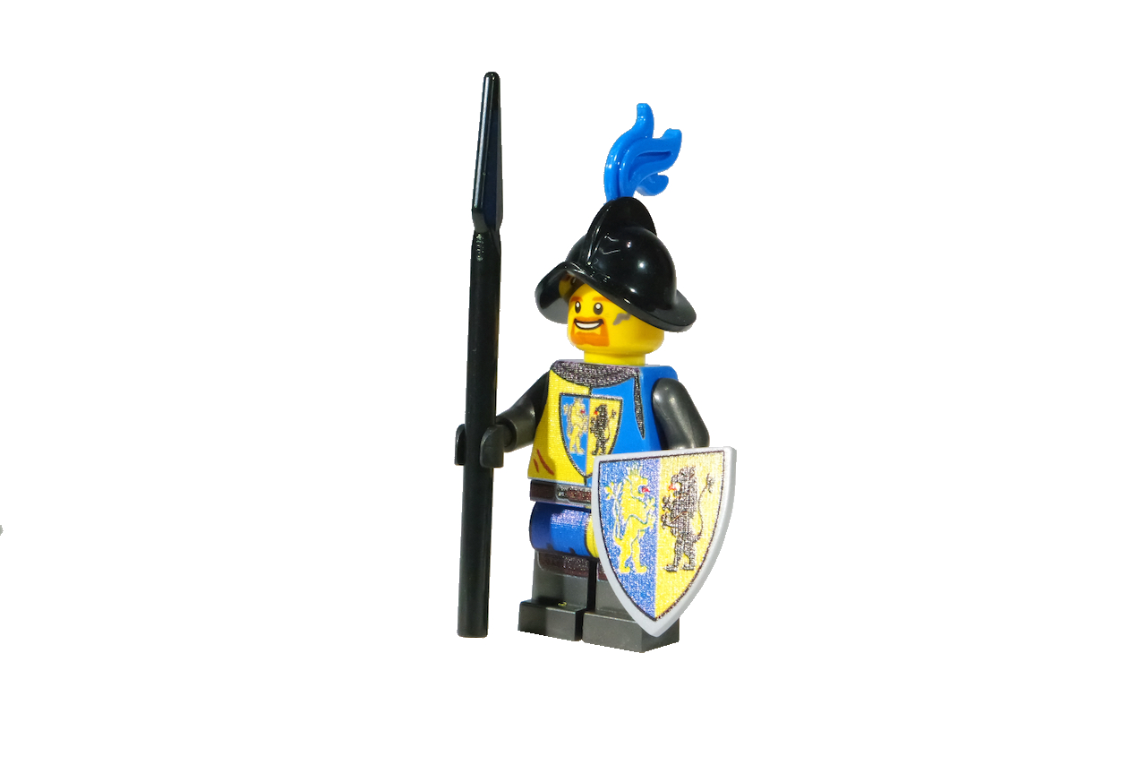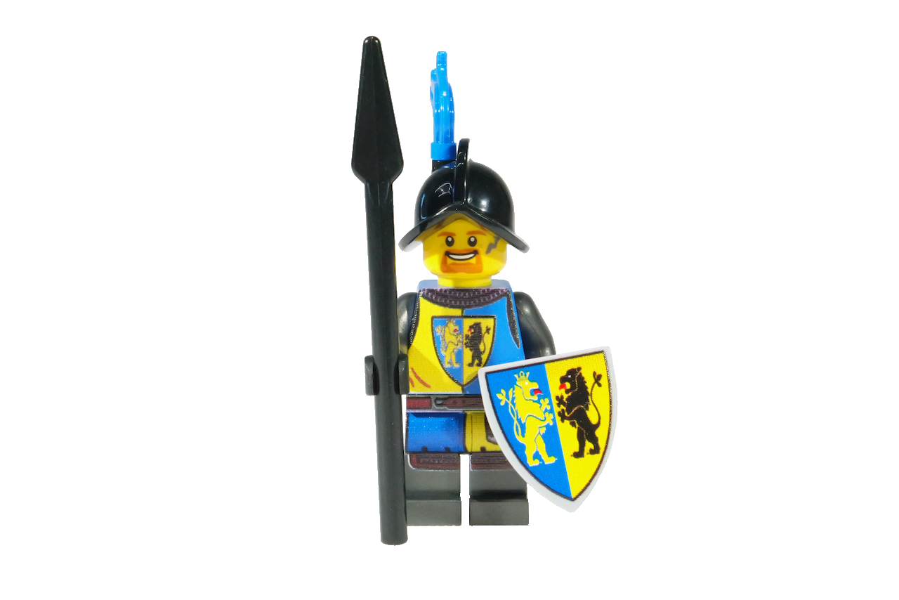 Ridder van Gelre minifiguur, samengesteld uit authentieke LEGO-onderdelen met een aangepaste print op de borst, beentjes en schild.